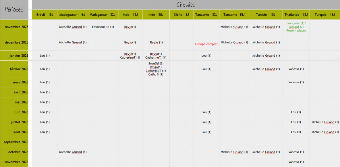 DEMANDER UN DEVIS Ensuite, cliquez sur le tableau ci-dessous pour accéder aux demandes (périodes-circuits) des personnes qui souhaitent créer ou rejoindre un groupe. Il est mis à jour régulièrement. Vous y trouverez également les identifiants des voyageurs afin de pouvoir communiquer directement avec eux à travers le Forum ci-contre.