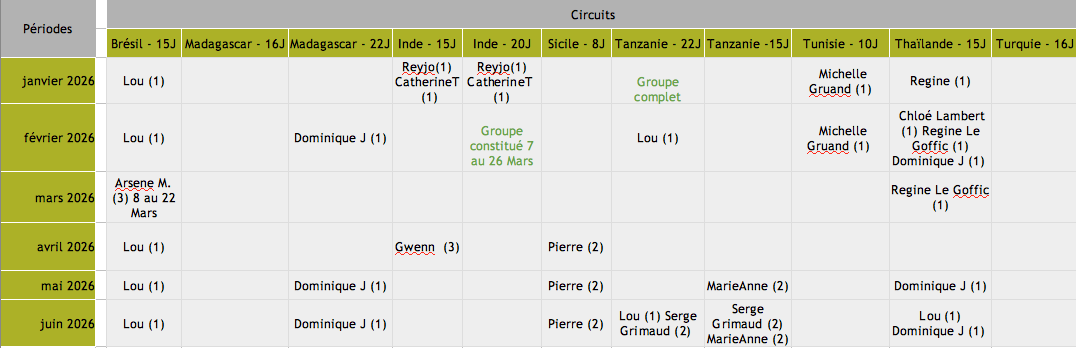 Ensuite, cliquez sur le tableau ci-dessous pour accéder aux demandes (périodes-circuits) des personnes qui souhaitent créer ou rejoindre un groupe. Il est mis à jour régulièrement. Vous y trouverez également les identifiants des voyageurs afin de pouvoir communiquer directement avec eux à travers le Forum ci-contre.